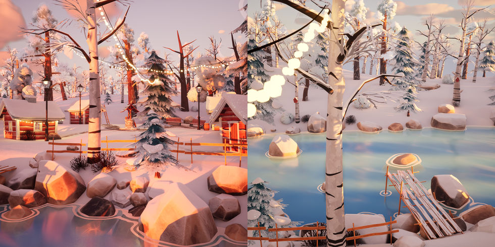 Trees swaying, leaves rustling, snow, smoke and water. Tree swaying and leaves rustling effect are done with nodes inside the asset materials in Unreal Engine shown below